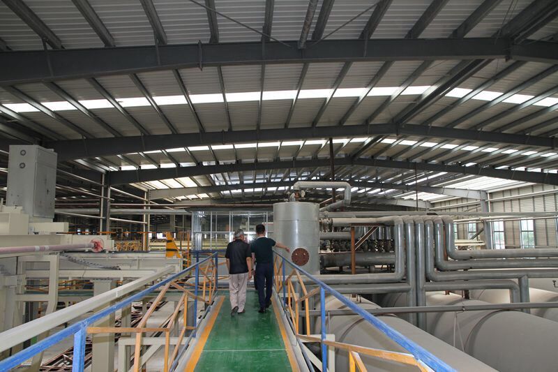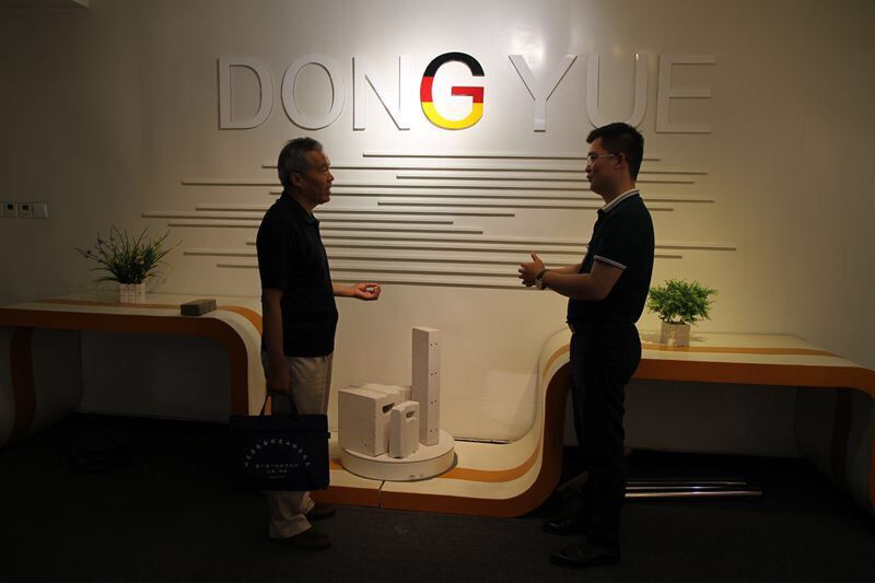 營(yíng)銷(xiāo)總經(jīng)理鄧奎與許世平副會(huì)長(zhǎng)參觀東岳氣混凝土板材生產(chǎn)線